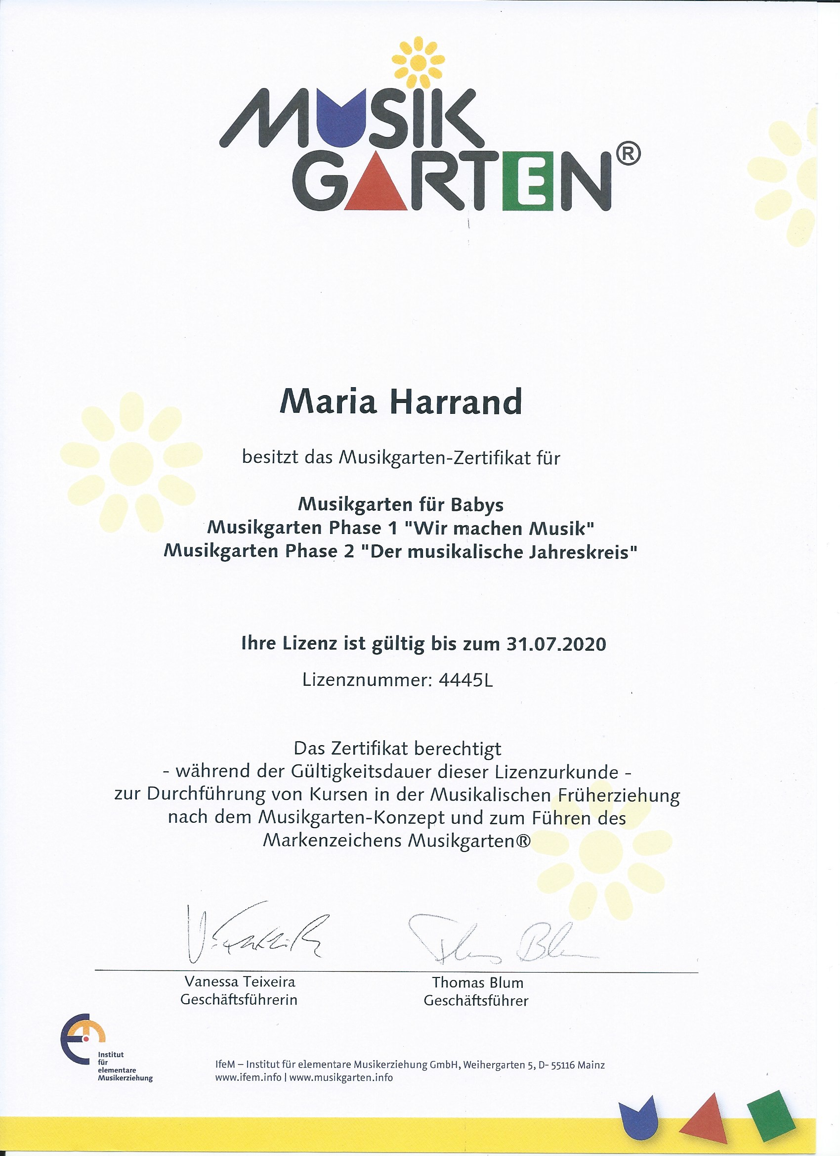 Für den Musikgarten erwarb ich das Zertifikat für Babys, Musikgarten Phase 1, sowie Musikgarten Phase 2 (Lizenznummer: 4445L)